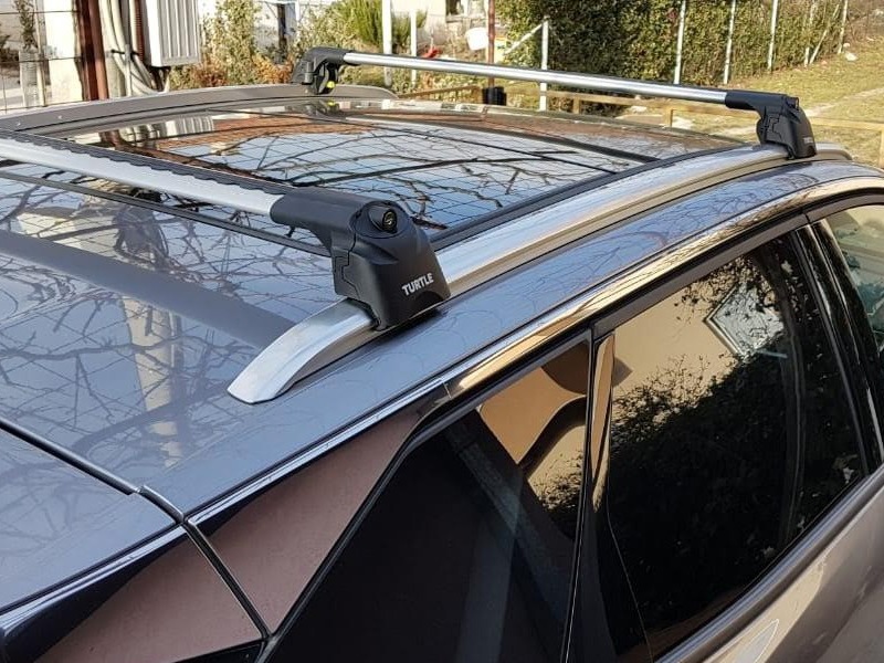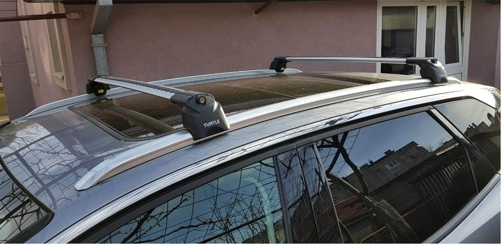 Универсальный багажник на интегрированные рейлинги Turtle Air 2 (Турция), без вылетов, с аэродинамическими дугами серебристого цвета. Грузоподъемность - до 75 кг.