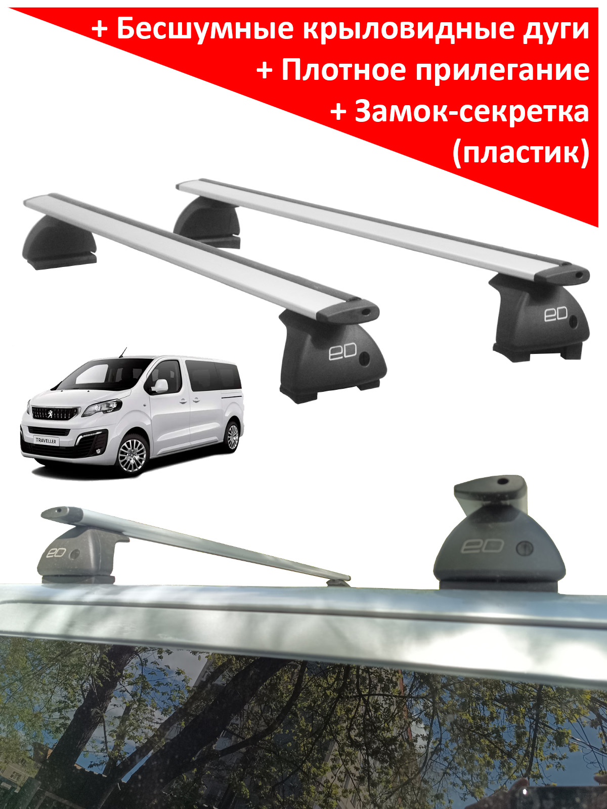 Автобагажник на крышу автомобиля Peugeot Traveller, минивен, 2016-... - ЕД (Россия), крыловидные дуги. Крепление в штатные места. Грузоподъемность до 75 кг