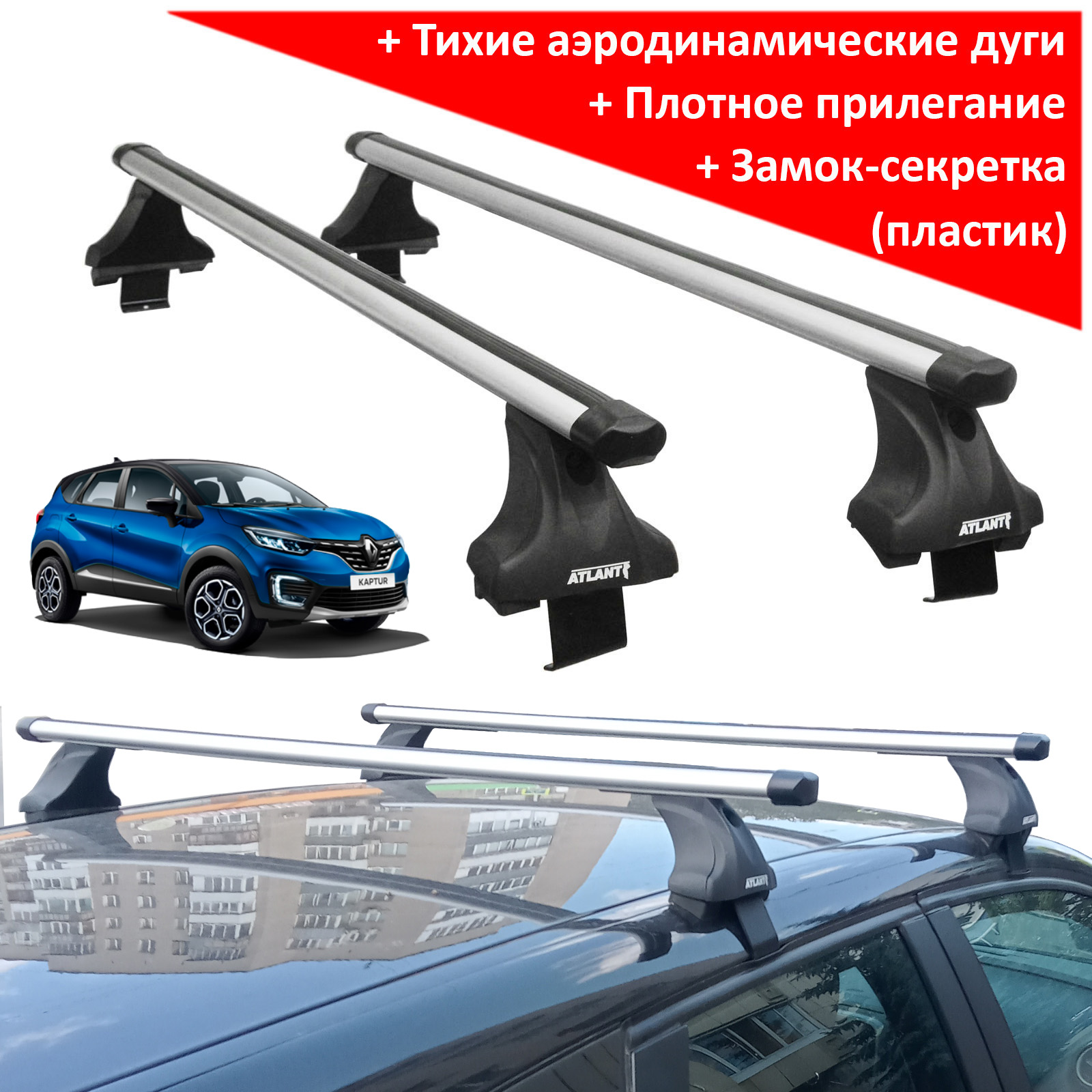 Багажник на крышу Renault Kaptur, Атлант, аэродинамические дуги Эконом, опора Е
