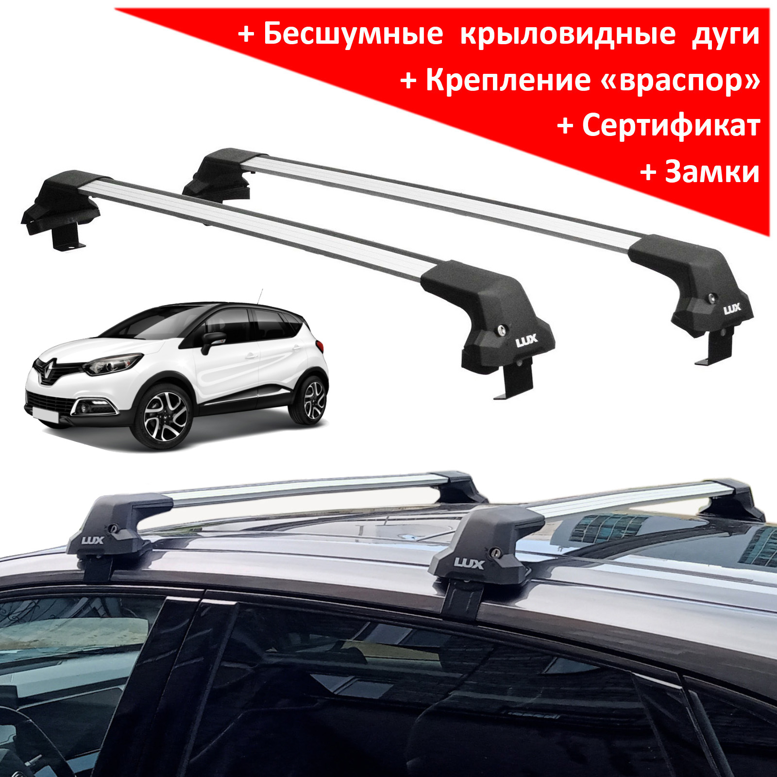 Представляем багажную систему Lux City на крышу Renault Kaptur от российского производителя - марки "Lux". Цвет дуг - серебристый.