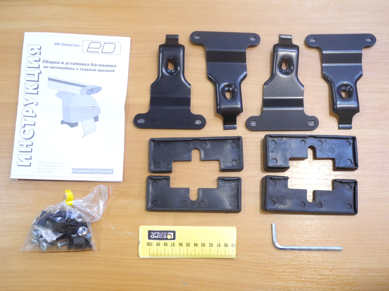 Багажная система Евродеталь состоит из трех основных частей: дуг, опор и адаптеров. Дуги изготовлены из стального прямоугольного профиля 20х30 мм, их длина - 1100 мм, поверх дуги имеется рельефная пластиковая оболочка черного цвета. Концы дуг закрываются парой заглушек. Дуги опираются на 4 стойки, производимые из прочного пластика. Крышки плотно закрываются на пластиковый замок (Дополнительная опция - металлические замки). Фиксация на крыше производится с помощью системы адаптеров в штатные отверстия в дверном проёме.