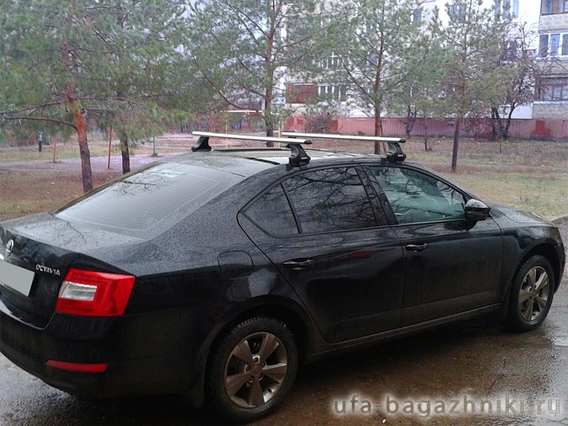 Автобагажник на крышу Skoda Octavia A7 2013-..., Атлант (Россия), с аэродинамическими дугами и аэродинамическими опорами типа E. Грузоподъемность до 75 кг (до 120 кг распределенной нагрузки)