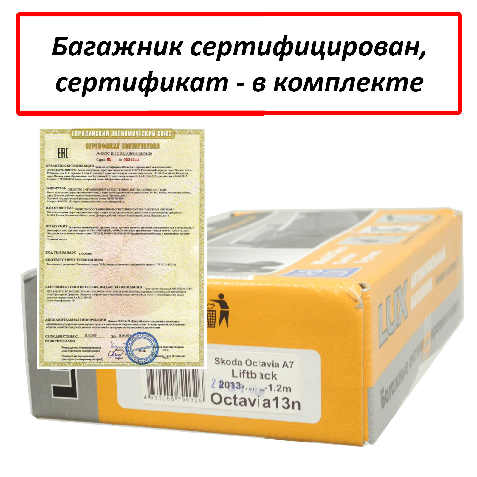 Автобагажник на крышу автомобиля Skoda Octavia A7 (с 2013 года) - Lux (Россия), крыловидные дуги (аэро-трэвэл 82 мм). Грузоподъемность до 75 кг