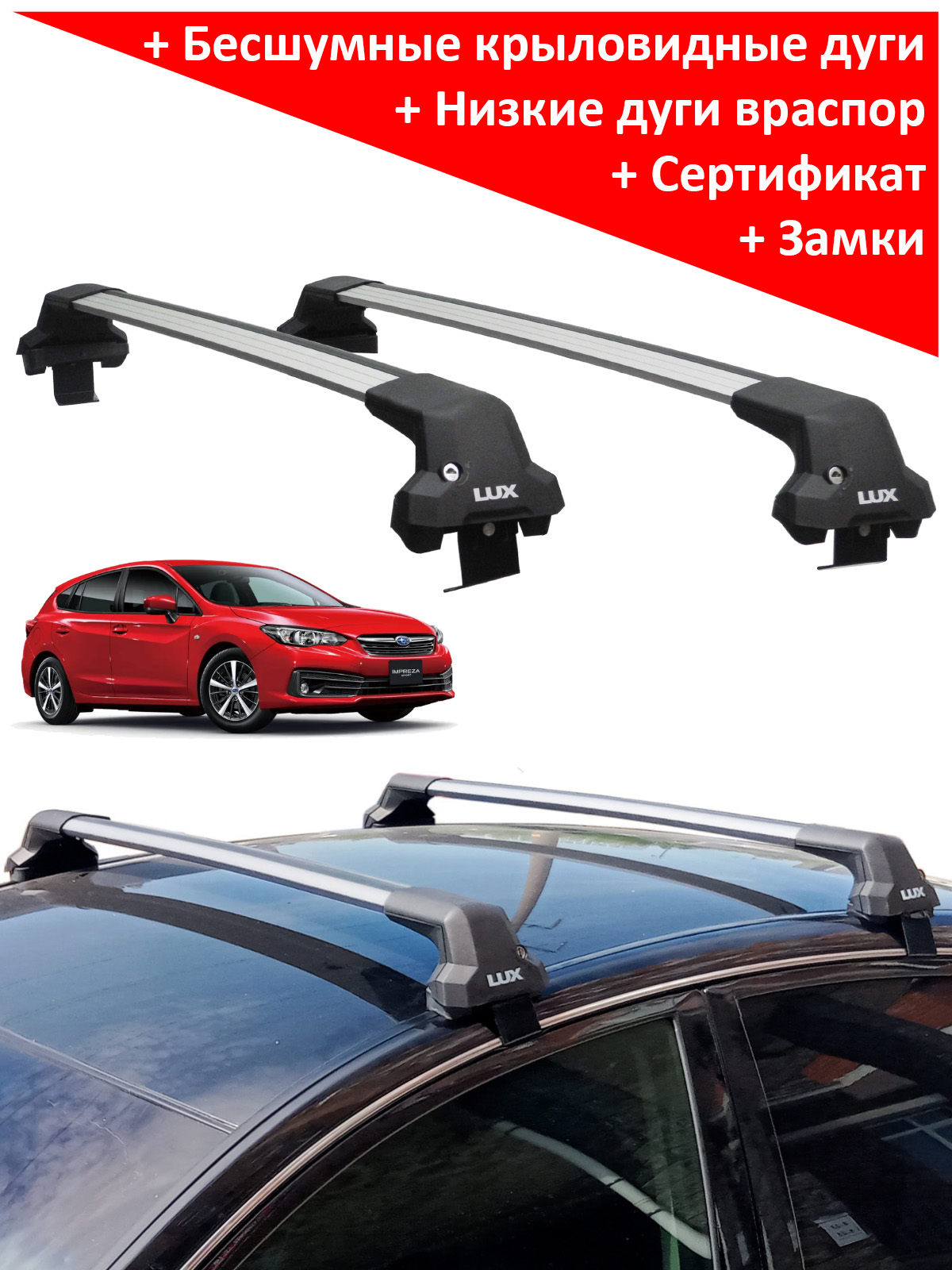 Представляем багажную систему Lux City на крышу Subaru Impreza V (хэтчбек, 2016-2023) от российского производителя - марки "Lux". Цвет дуг - серебристый.