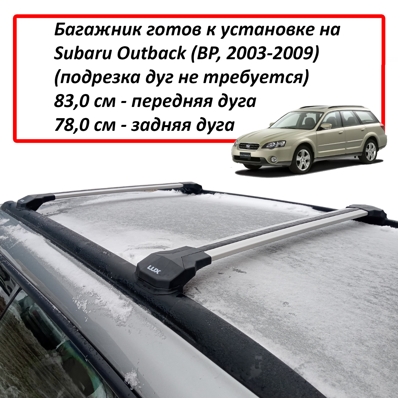 Представляем багажник на рейлинги Subaru Outback 2003-09 - Lux Condor от российского производителя багажных систем компании Lux. Крепление данной багажной системы производится на интегрированные рейлинги, рекомендуемая нагрузка - до 75 кг.
