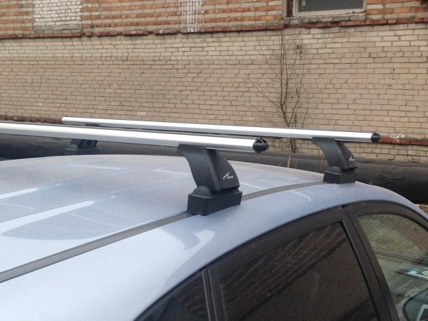 Багажник состоит из 2 основных частей: дуг и опор с адаптерами. Тип крепления опор - в штатные места. Дуги длиной 1100 мм выполнены из анодированного алюминия, сверху имеют резиновую прокладку, а по краям - пластиковые заглушки. Установка производится в штатные места при помощи системы винтов.