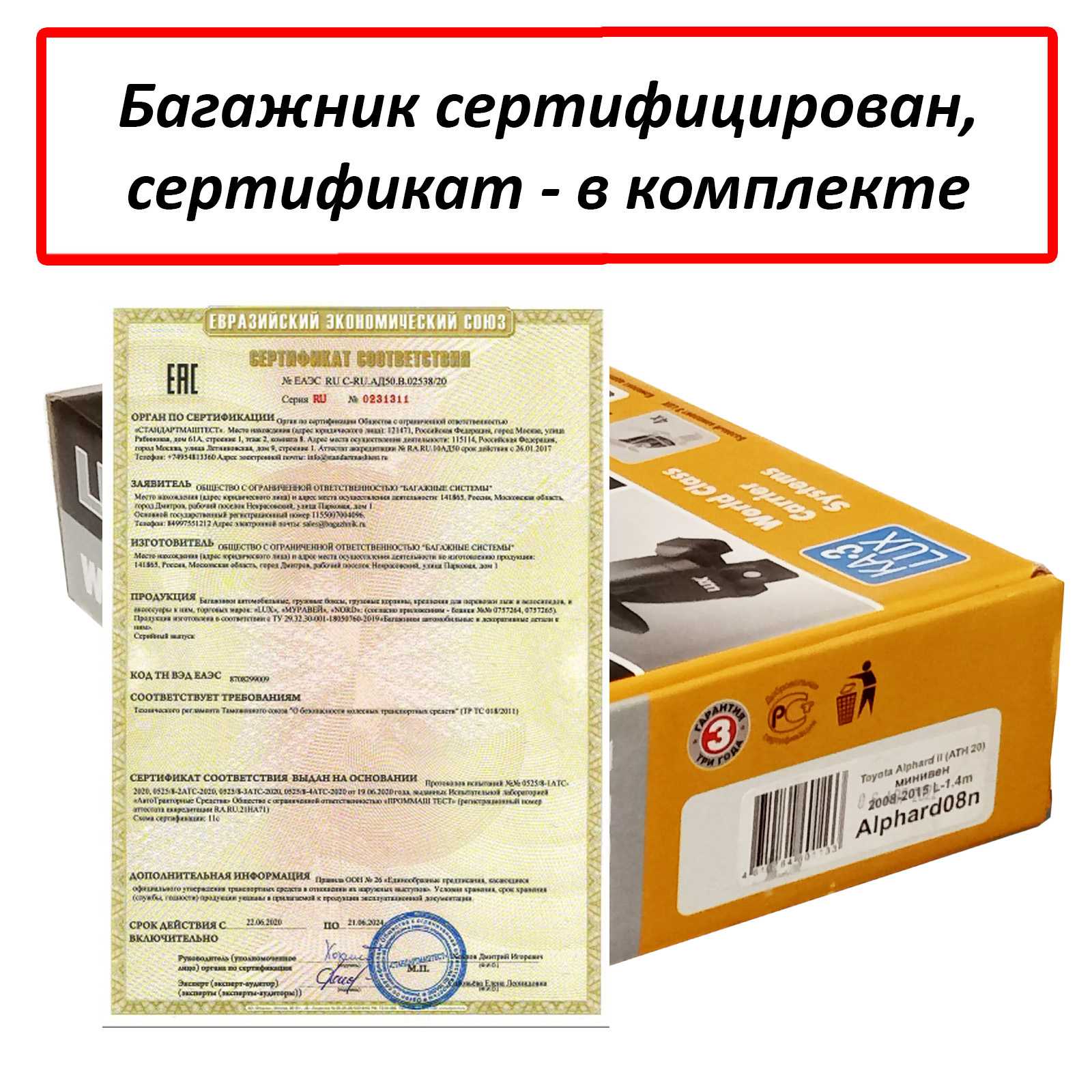 Автобагажник на крышу автомобиля Toyota Alphard 2 (2008-2014) - Lux (Россия), черные крыловидные дуги (аэро-трэвэл 82 мм). Грузоподъемность до 75 кг