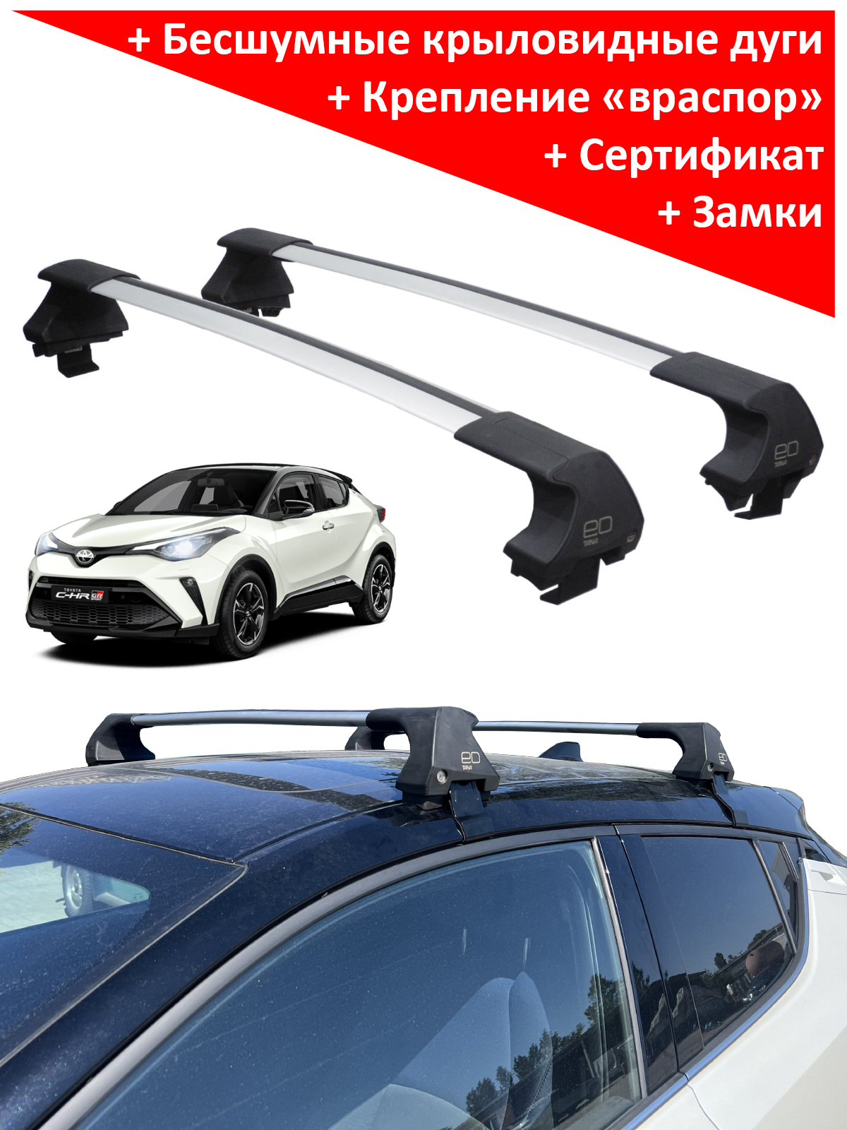 Бесшумная багажная система ED Tana (враспор, без вылетов) на крышу Toyota C-HR I (2016-2023), производство - ED (Россия). Серебристые дуги. Крепление за дверной проём.
