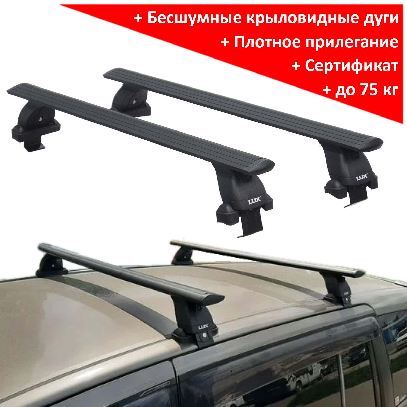 Багажная система Lux - это простая, но надежная конструкция, состоящая из трех основных частей: дуг, опор и адаптеров. Профиль дуги - аэродинамический, крыловидный, материал - анодированный алюминий, цвет - серебристый, длина 1200 мм, ширина - 82 мм. Поверх дуги проходит Т-образный профиль, предназначение которого - легкая и быстрая установка дополнительного оборудования - велокреплений, лыжный насадок. В свободном состоянии Т-профиль закрывается черным резиновым уплотнителем. На концах дуг располагается пара оригинальных заглушек, имеющих отодвигающийся лючок для доступа к Т-профилю. Дуги опираются на 4 стойки, производимые из прочного пластика. В качестве дополнительной опции возможна установка на крышки опор металлических замков Lux. Фиксация на крыше производится с помощью системы адаптеров за дверной проём.