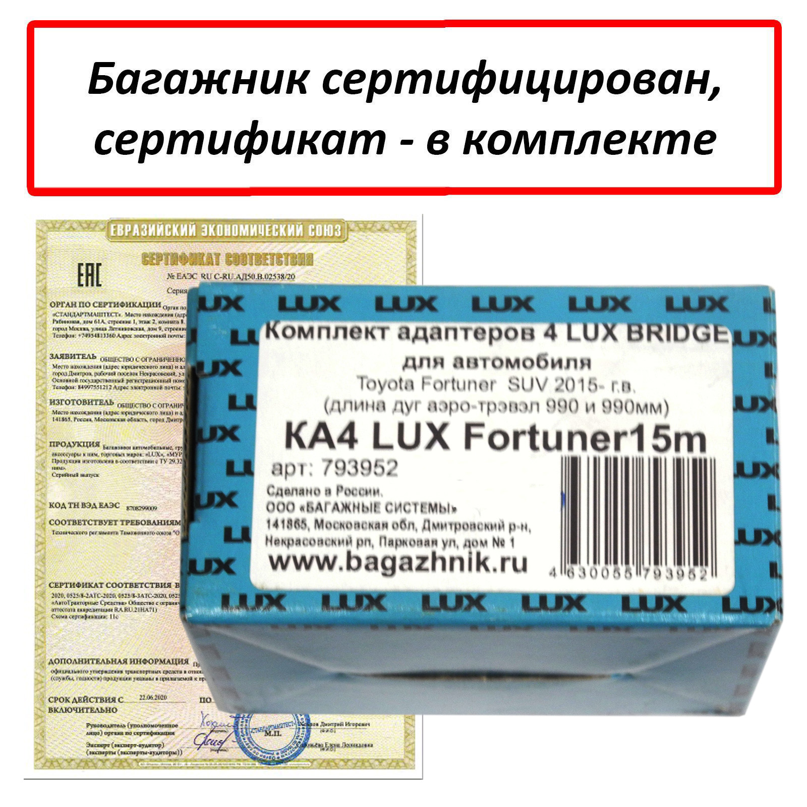 Бесшумная багажная система Lux Bridge для Toyota Fortuner II 2015-…, производство - Lux (Россия, Москва). Черные дуги. Грузоподъемность до 75 кг