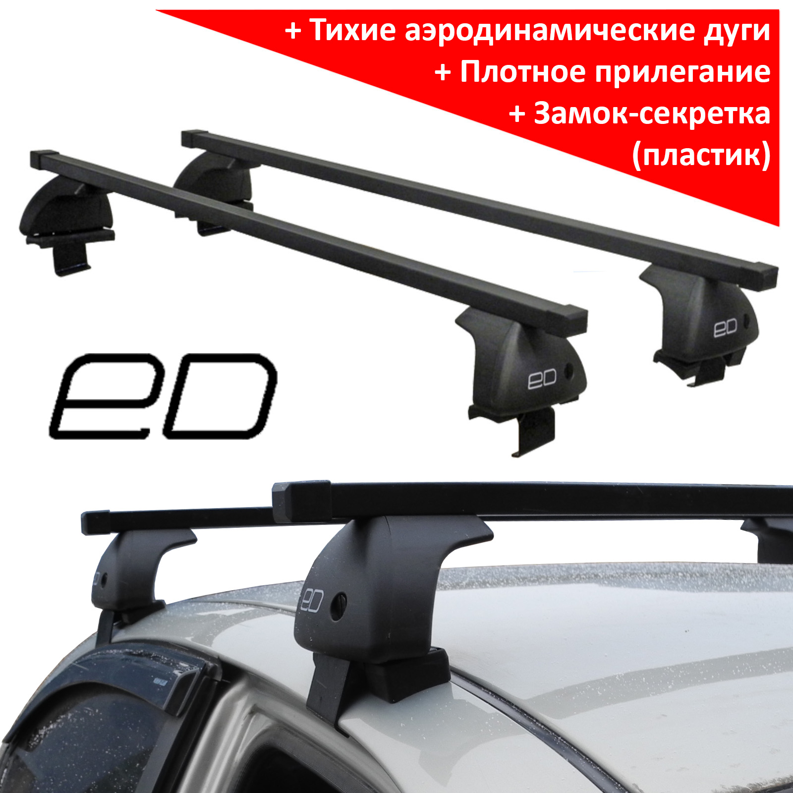 Багажная система ЕД состоит из трех основных частей: дуг, опор и адаптеров. Дуги изготовлены из стального прямоугольного профиля 20х30 мм, их длина - 1250 мм, поверх дуги имеется рельефная пластиковая оболочка черного цвета. Концы дуг закрываются парой заглушек. Дуги опираются на 4 стойки, производимые из прочного пластика. Крышки плотно закрываются на пластиковый замок (Дополнительная опция - металлические замки). Фиксация на крыше производится с помощью системы адаптеров за дверной проём.
