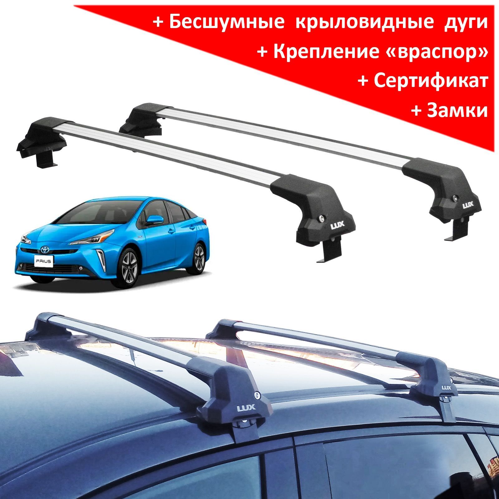 Багажник на крышу Toyota Prius XW50 (2015-2022), Lux City (без выступов), с замком, серебристые крыловидные дуги