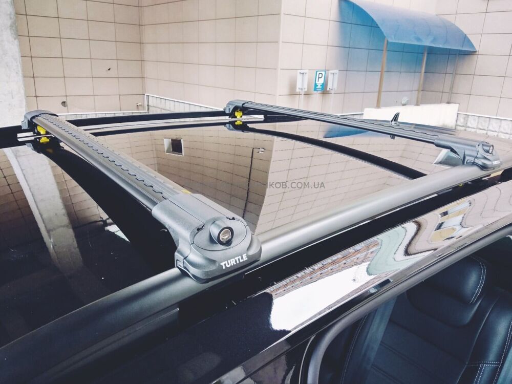Багажник на рейлинги Turtle Air 1 (Турция), без вылетов, с аэродинамическими дугами чёрного цвета (122 см). Грузоподъемность - до 75 кг.