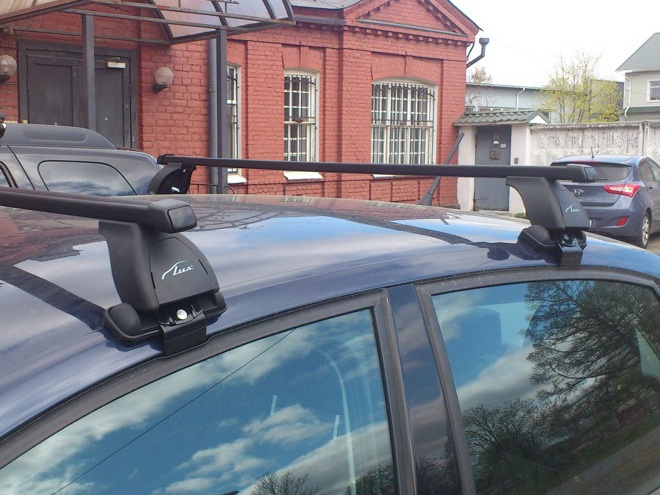 Багажная система Lux - это простая, но надежная конструкция, состоящая из трех основных частей: дуг, опор и адаптеров. Дуги изготовлены из стального прямоугольного профиля 20х30 мм, их длина - 1200 мм, поверх дуги имеется рельефная пластиковая оболочка черного цвета. Концы дуг закрываются парой заглушек. Дуги опираются на 4 стойки, производимые из прочного пластика. Фиксация на крыше производится с помощью системы адаптеров за дверной проём. Задняя дуга также крепится дополнительно системой винтов в штатные места.