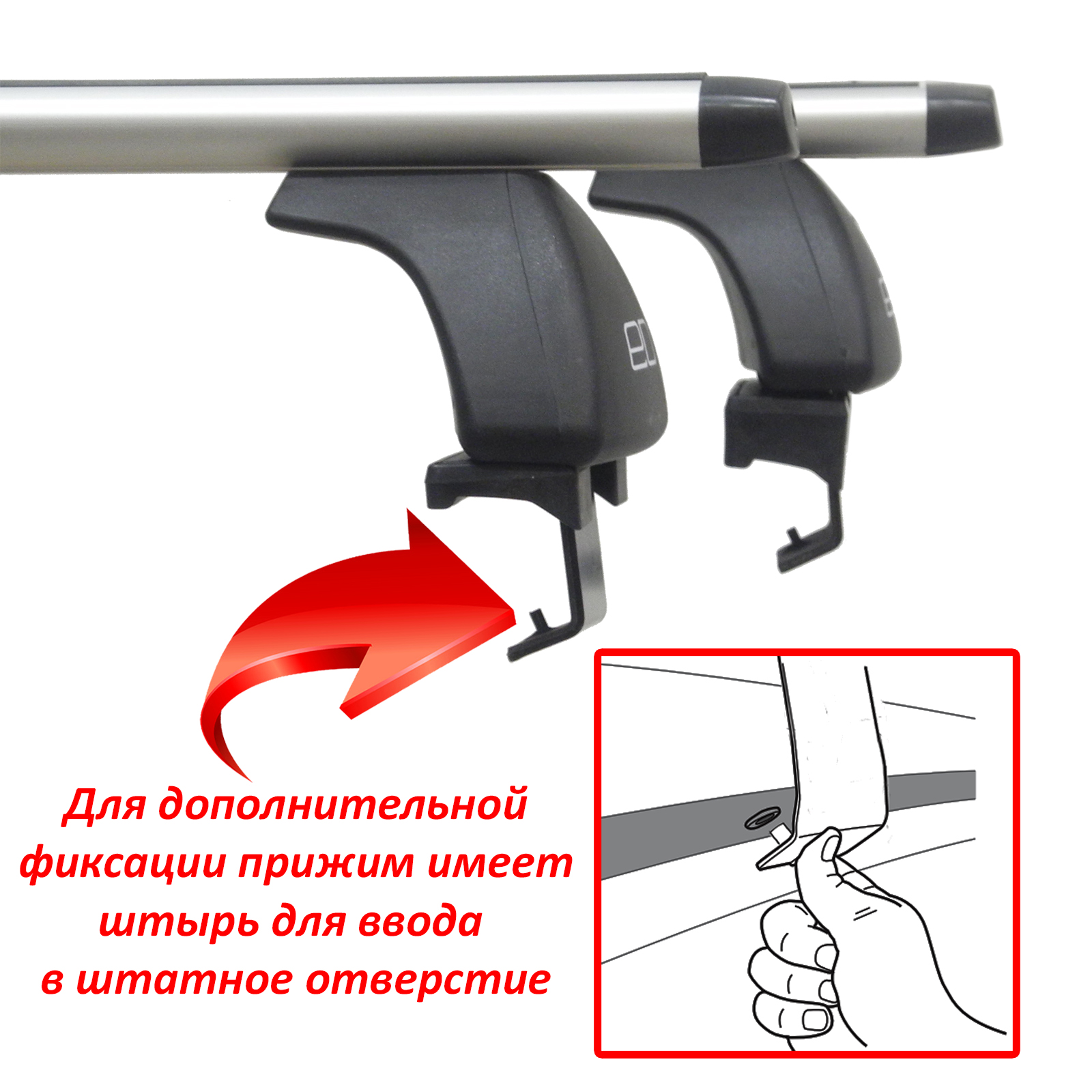 Багажная система ЕД - это простая, но надежная конструкция, состоящая из трех основных частей: дуг, опор и адаптеров. Профиль дуги - аэродинамический, материал - анодированный алюминий, цвет - серебристый, длина 1250 мм. Поверх дуги проходит Т-образный профиль, предназначение которого - легкая и быстрая установка дополнительного оборудования - велокреплений, лыжный насадок. В свободном состоянии Т-профиль закрывается черным резиновым уплотнителем. На концах дуг располагается пара заглушек. Дуги опираются на 4 стойки, производимые из прочного пластика. Крышки плотно закрываются на пластиковый замок (Дополнительная опция - металлические замки). Фиксация на крыше производится с помощью системы адаптеров за дверной проём.