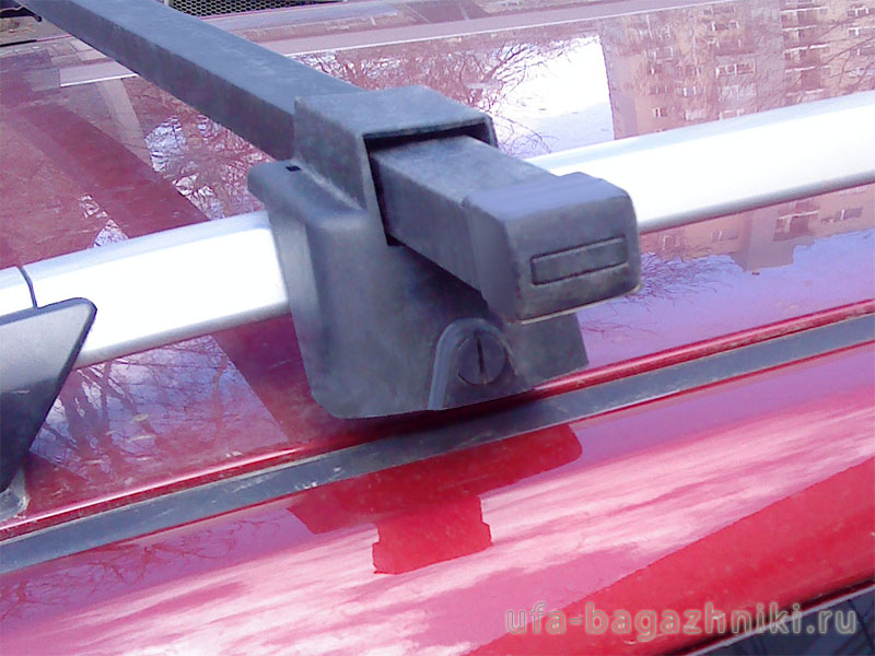 Основу багажника составляют две прочные металлические дуги со следующими параметрами: материал - сталь, профиль - прямоугольный, 22х32 мм, толщина стенки - 1,5 мм, длина - 1250, поперечины защищены мягкой и эластичной пластиковой оболочкой черного цвета, на концах поперечин расположены заглушки. Закрепление дуг на рейлингах производится с помощью металлических прижимов, закрытых пластиковым корпусом.