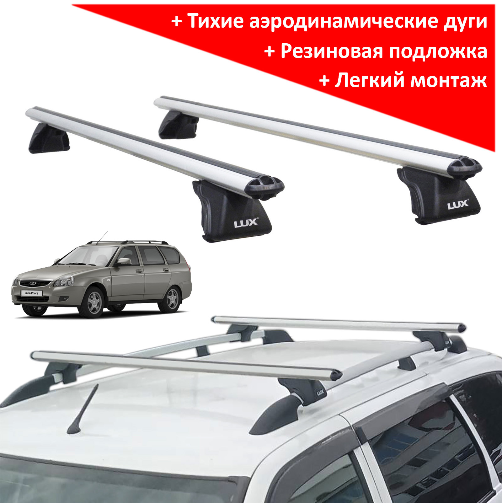 Багажник на рейлинги Лада Приора универсал - Lux Классик с аэродинамическими дугами (53 мм)