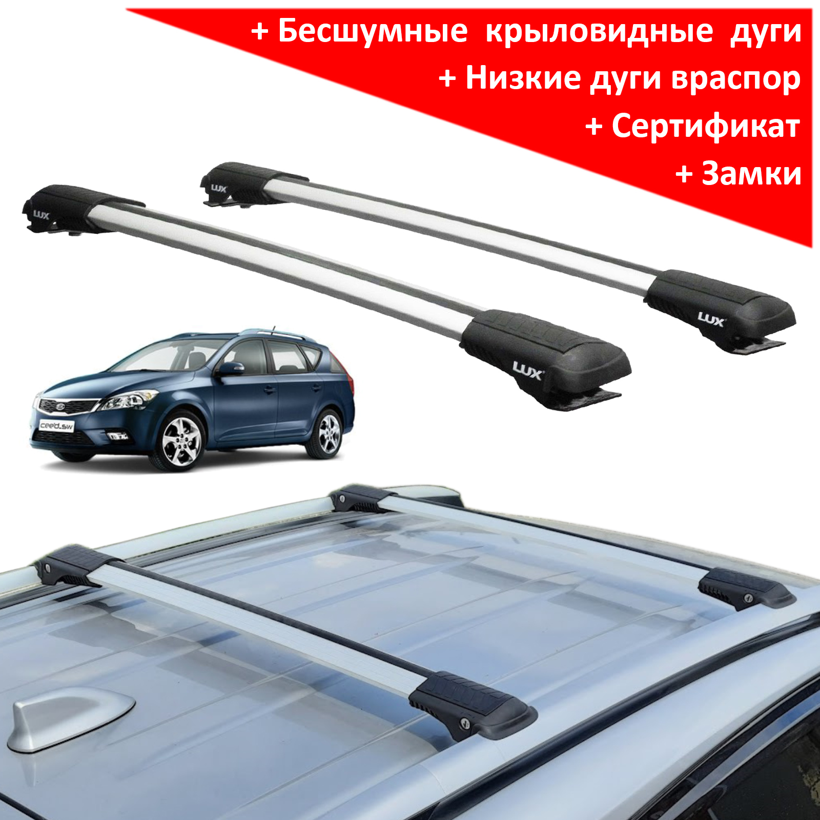 Багажник на рейлинги Kia Ceed universal 2007-12, Lux Hunter, серебристый, крыловидные аэродуги