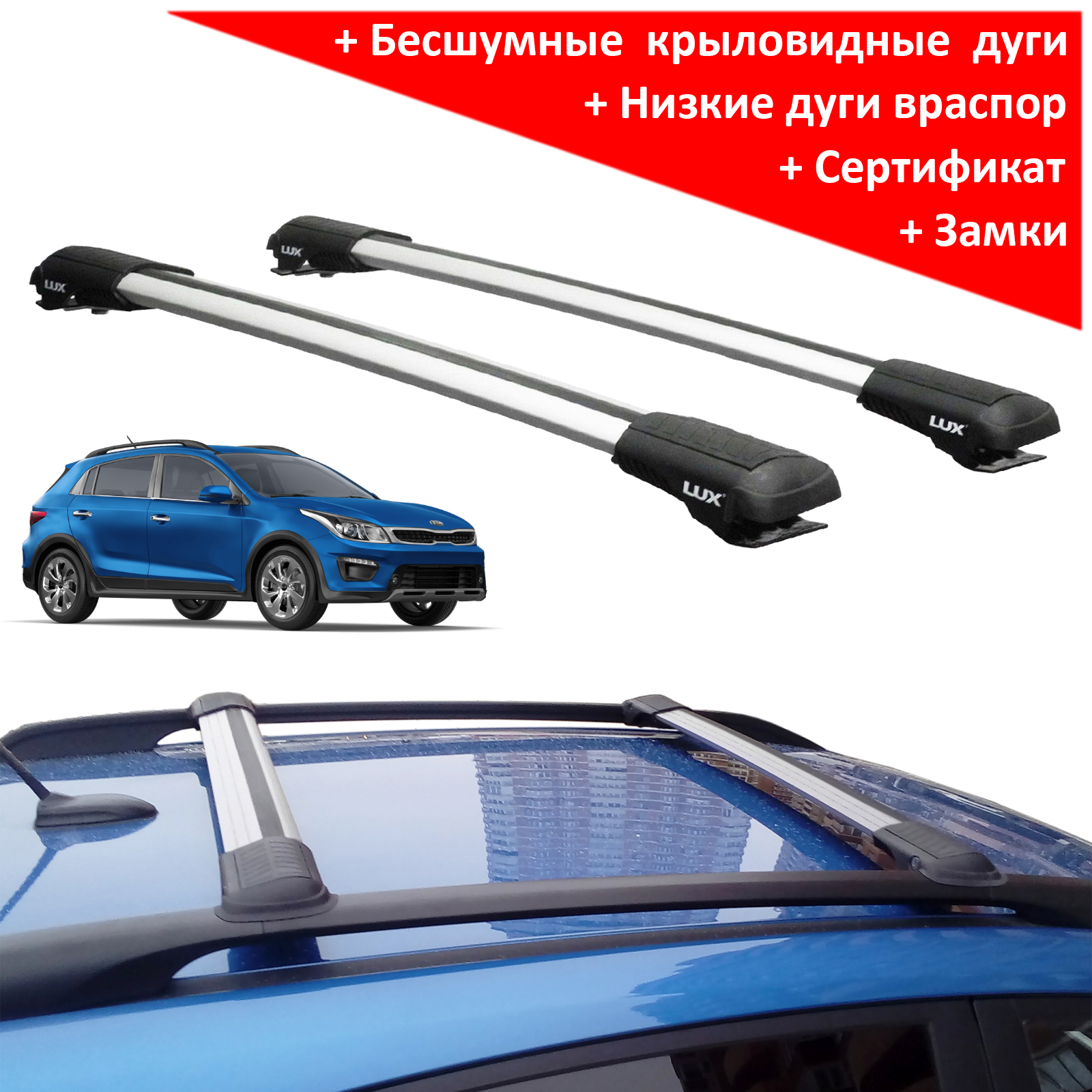 Багажник на рейлинги Kia Rio X-Line, Lux Hunter, серебристый, крыловидные аэродуги