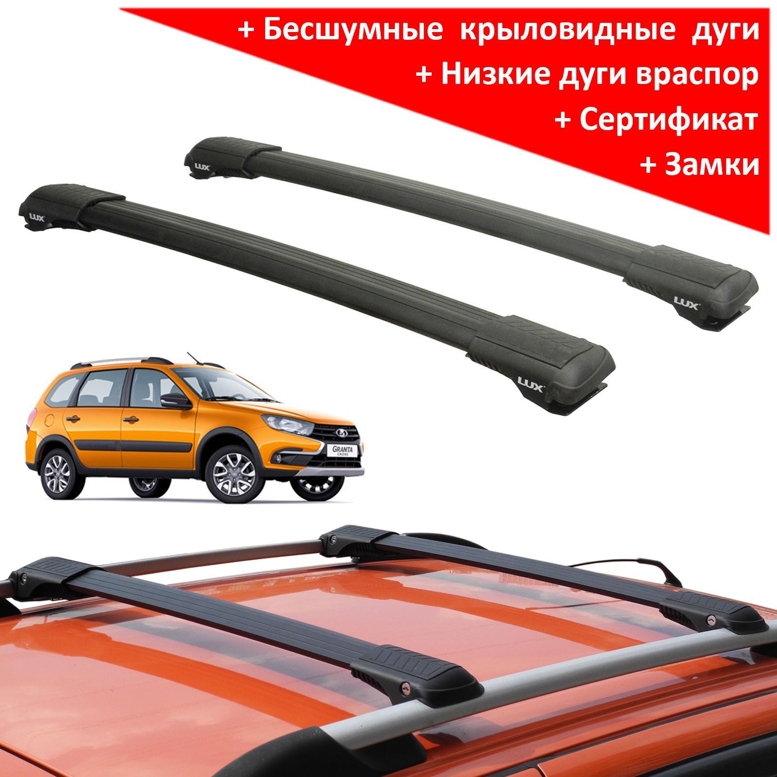 Багажник на рейлинги Lada Kalina / Lada Granta универсал, Lux Hunter, черный, крыловидные аэродуги