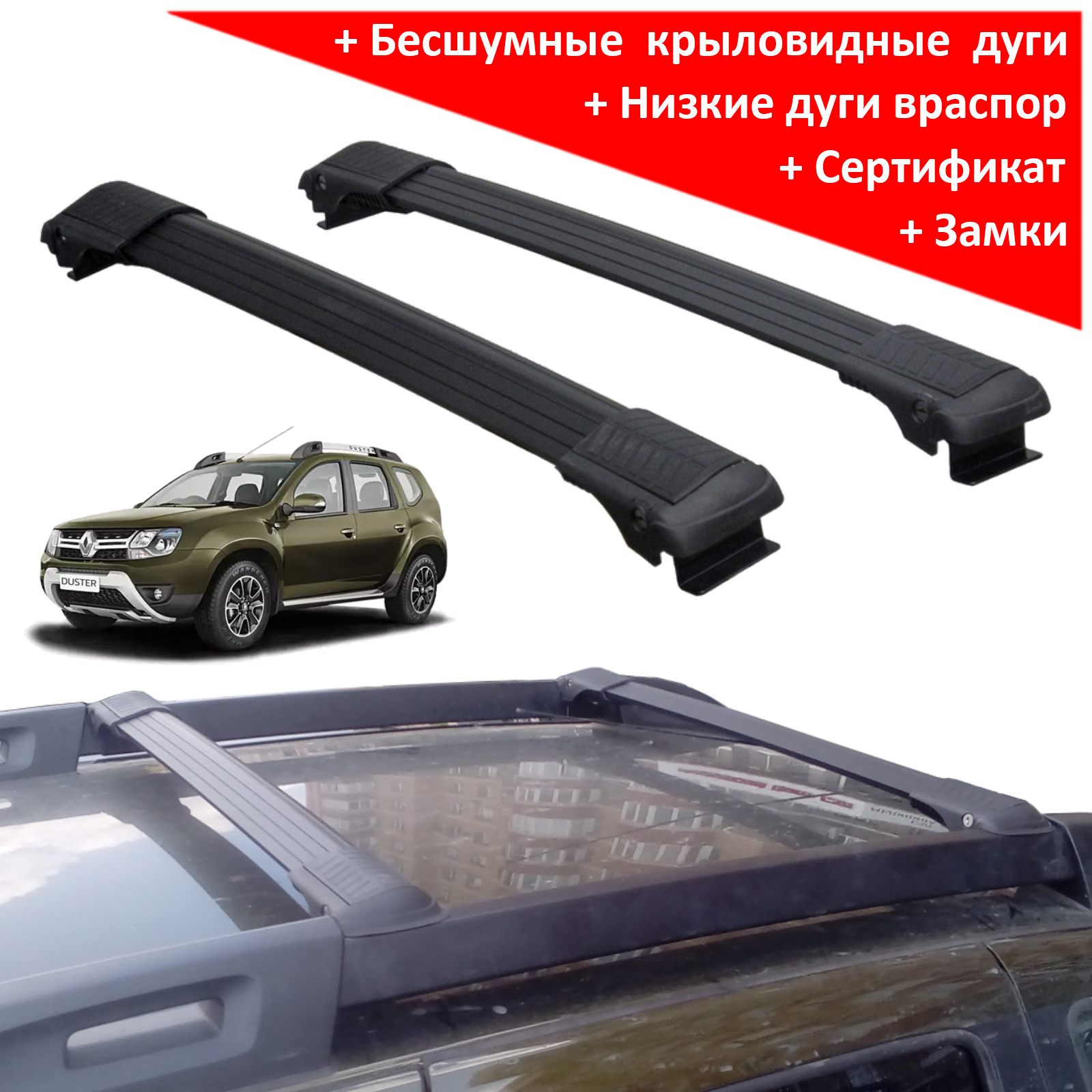 Представляем багажную систему на рейлинги Renault Duster II (2015-2020) - Lux Hunter  от российского производителя "Lux", цвет дуг - черный.