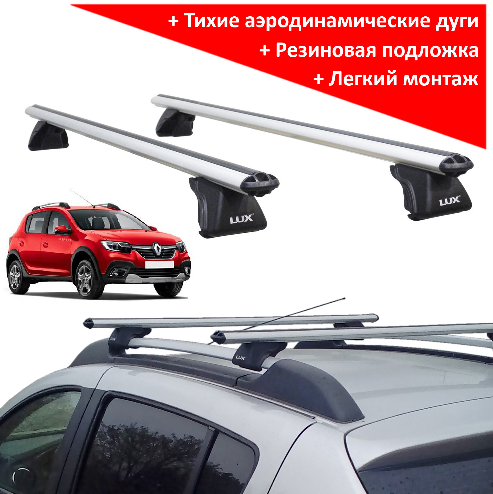 Установка верхнего багажника существенно упростит вопрос перевозки габаритных и длинномерных грузов. Представляем багажник на рейлинги Renault Sandero / Sandero Stepway марки Lux Классик с алюминиевыми аэродинамическими дугами шириной 53 мм, производство - Lux (Россия). Установка данной багажной системы производится на имеющиеся на машине рейлинги. Рекомендуемый вес перевозимого груза - до 75 кг.