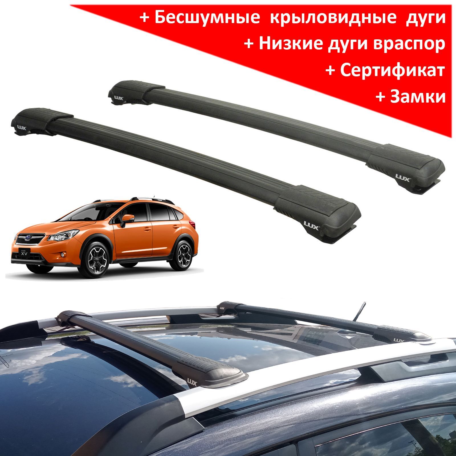 Представляем багажную систему на рейлинги Subaru XV 2011-... - Lux Hunter L54-B от российского производителя "Lux". Размер L54-B предназначен для установки на автомобили с расстоянием между рейлингами сзади 920-1020 мм, спереди 980-1080 мм, цвет дуг - черный.