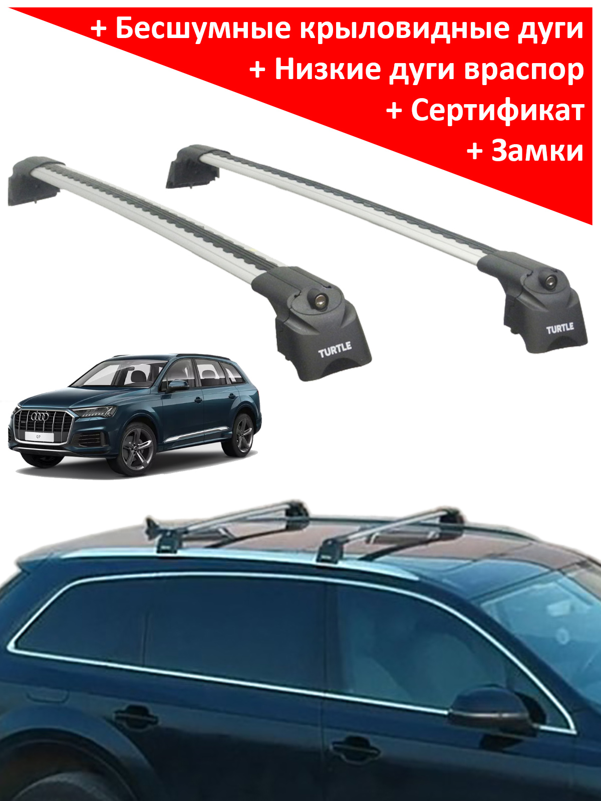 Багажник на Audi Q7 2015-..., Turtle Air 3 (Турция), без вылетов, с аэродинамическими дугами серебристого цвета. Грузоподъемность - до 75 кг.