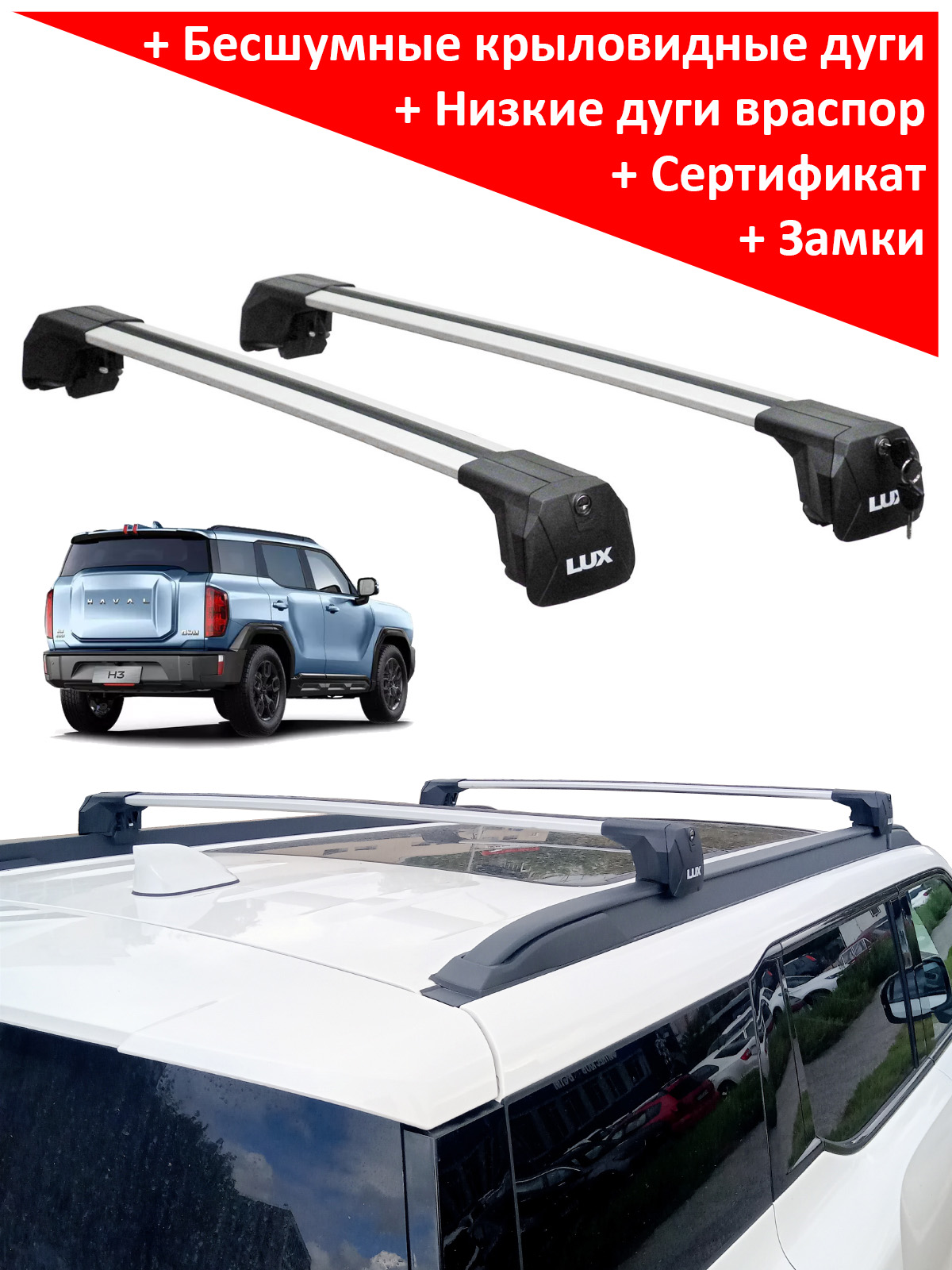 Багажник на интегрированные рейлинги Haval H3 (2024-...), Lux Scout 2 (враспор, без вылетов), серебристые крыловидные дуги, с замком. Нагрузка до 85 кг.