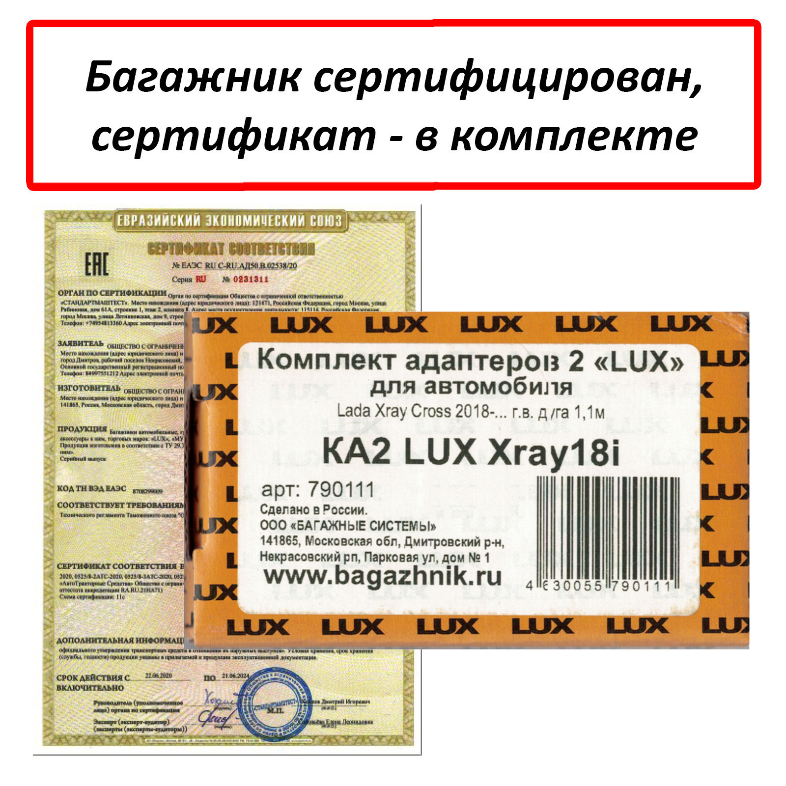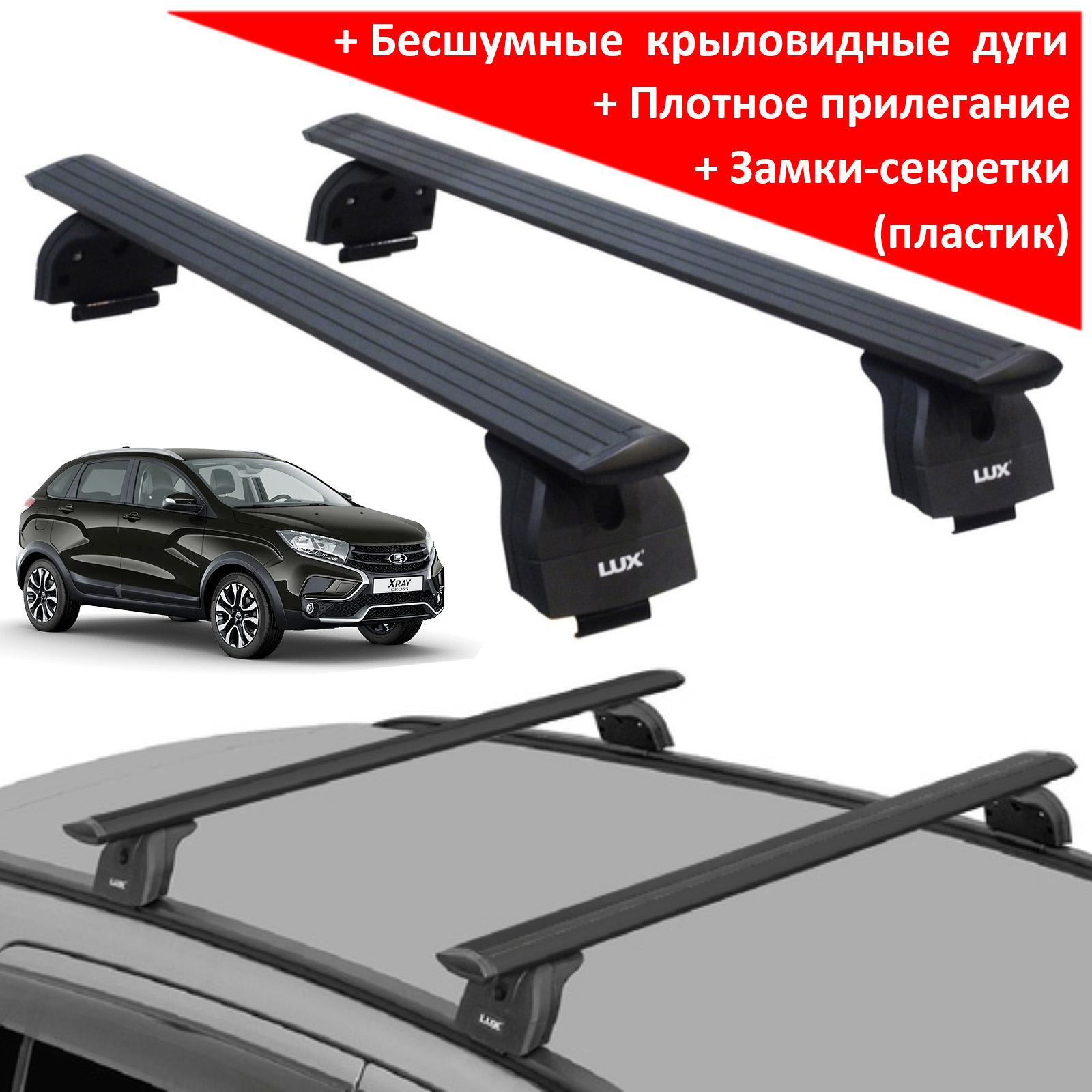 Автомобильный багажник Lux (Россия), крыловидные дуги (аэро-трэвэл 82 мм) черного цвета, для Lada Xray / Lada Xray Cross, с интегрированными рейлингами.