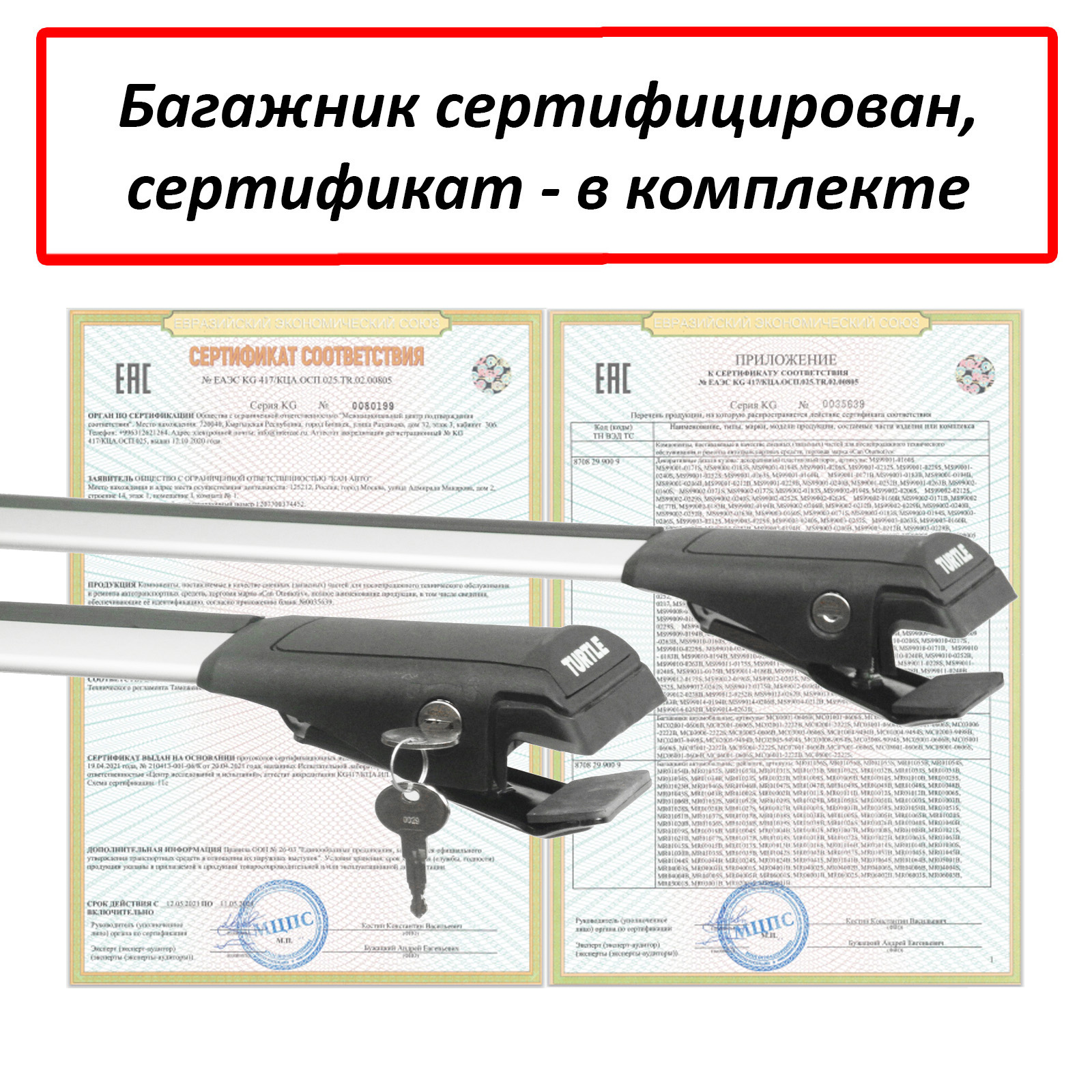 Бесшумная багажная система Turtle Shark (враспор, без вылетов), производство - Turtle Can Otomotive (Турция). Длина 106 см, серебристые дуги. Грузоподъемность до 75 кг