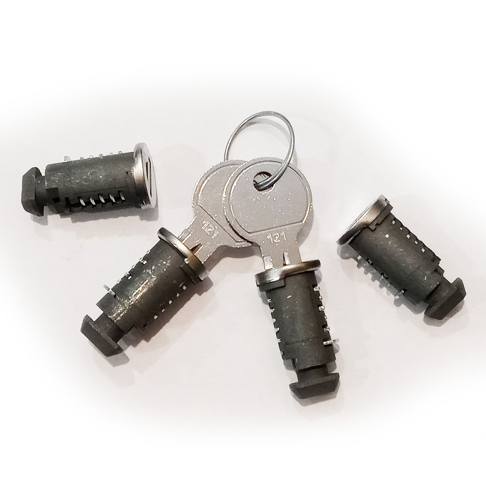 Набор из 4 металлических замков-личинок и 2 ключей. Предназначены для замены пластиковых замков в опорах багажных систем "Атлант".