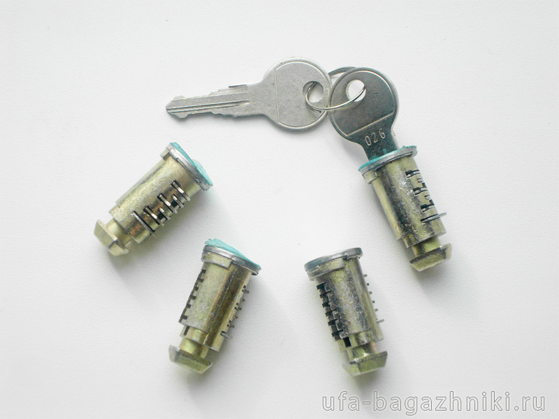Набор из 4 металлических замков-личинок и 2 ключей. Предназначены для замены пластиковых замков в опорах багажных систем БК-2 "Lux"