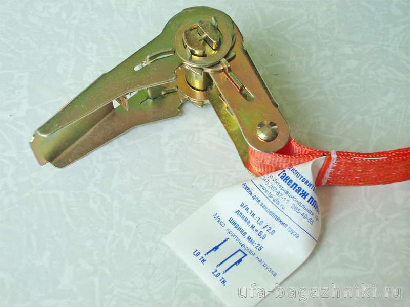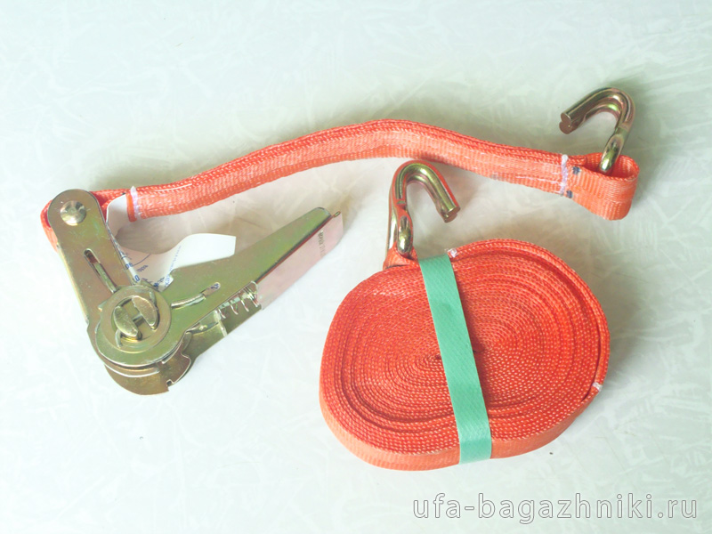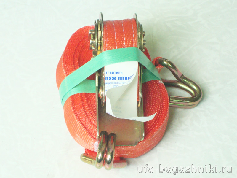 Фиксация груза производится затягивающим механизмом и двумя двойными крюками на концах ремня. Купить крепежные ремни "Такелаж плюс" вы можете в нашем интернет-магазине "Уфа-багажники". Доставка по Уфе и России.