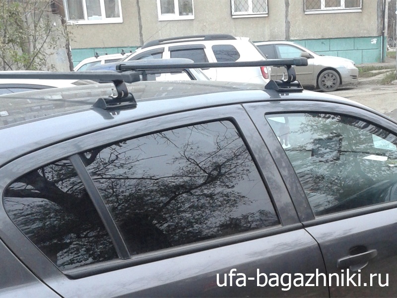 Универсальный автобагажник на крышу Opel Astra H (sedan 2005-..., hatchback 2004-...) Муравей С-15 (Россия) на иномарки, со стальными прямоугольными дугами, крепление в штатные места. Грузоподъемность до 75 кг.